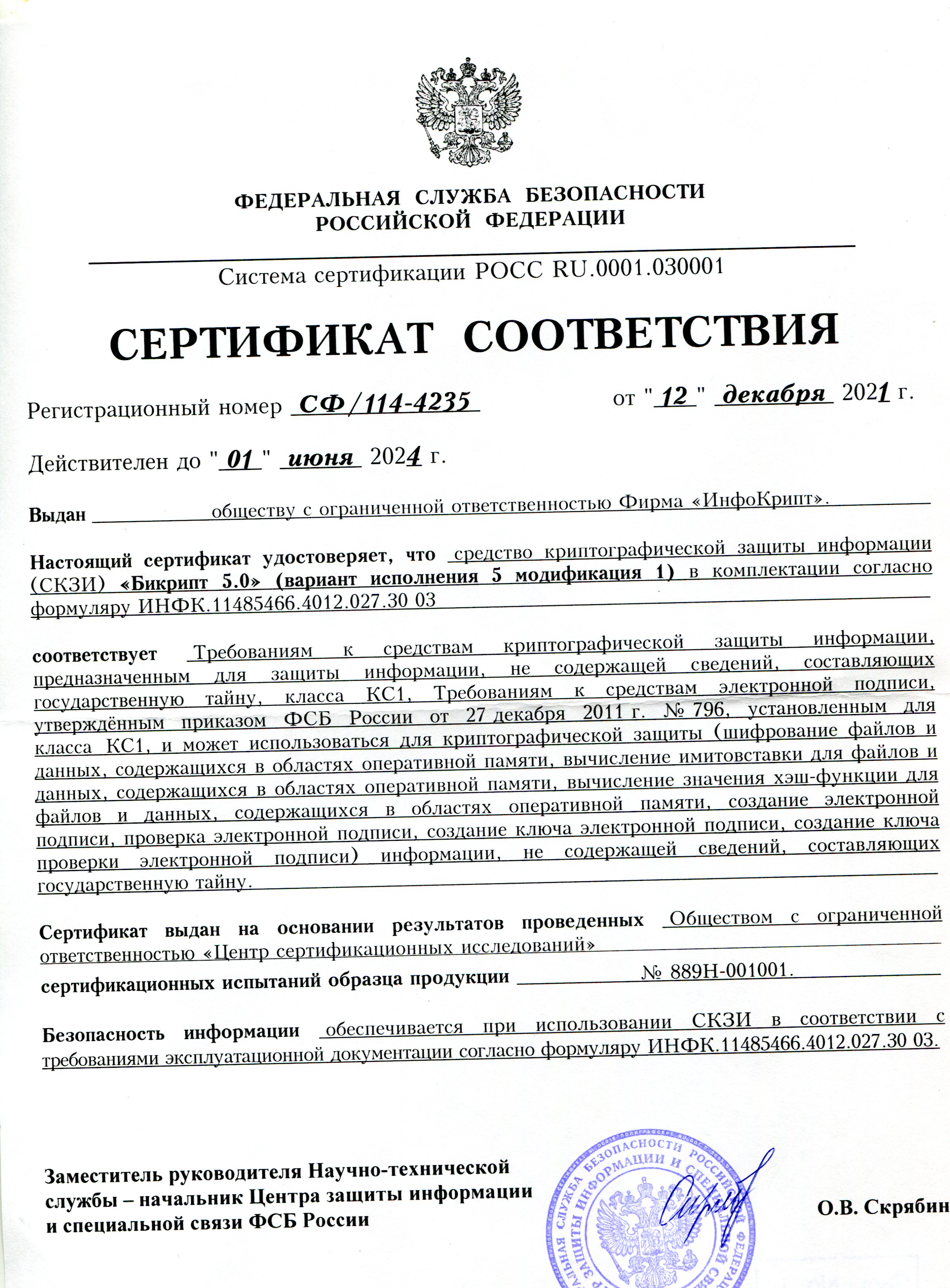 СКЗИ "Бикрипт 5.0" обеспечивает зашифрование/расшифрование информации, расчет значений хэш-функции, формирование/проверку ЭП и генерацию ключевой информации в соответствии с: